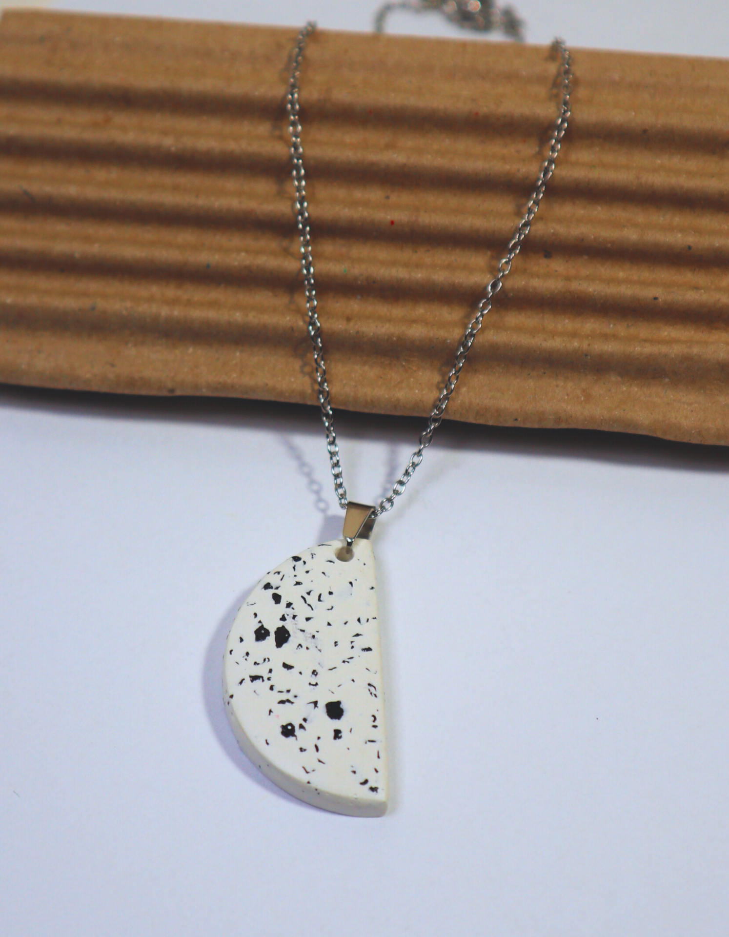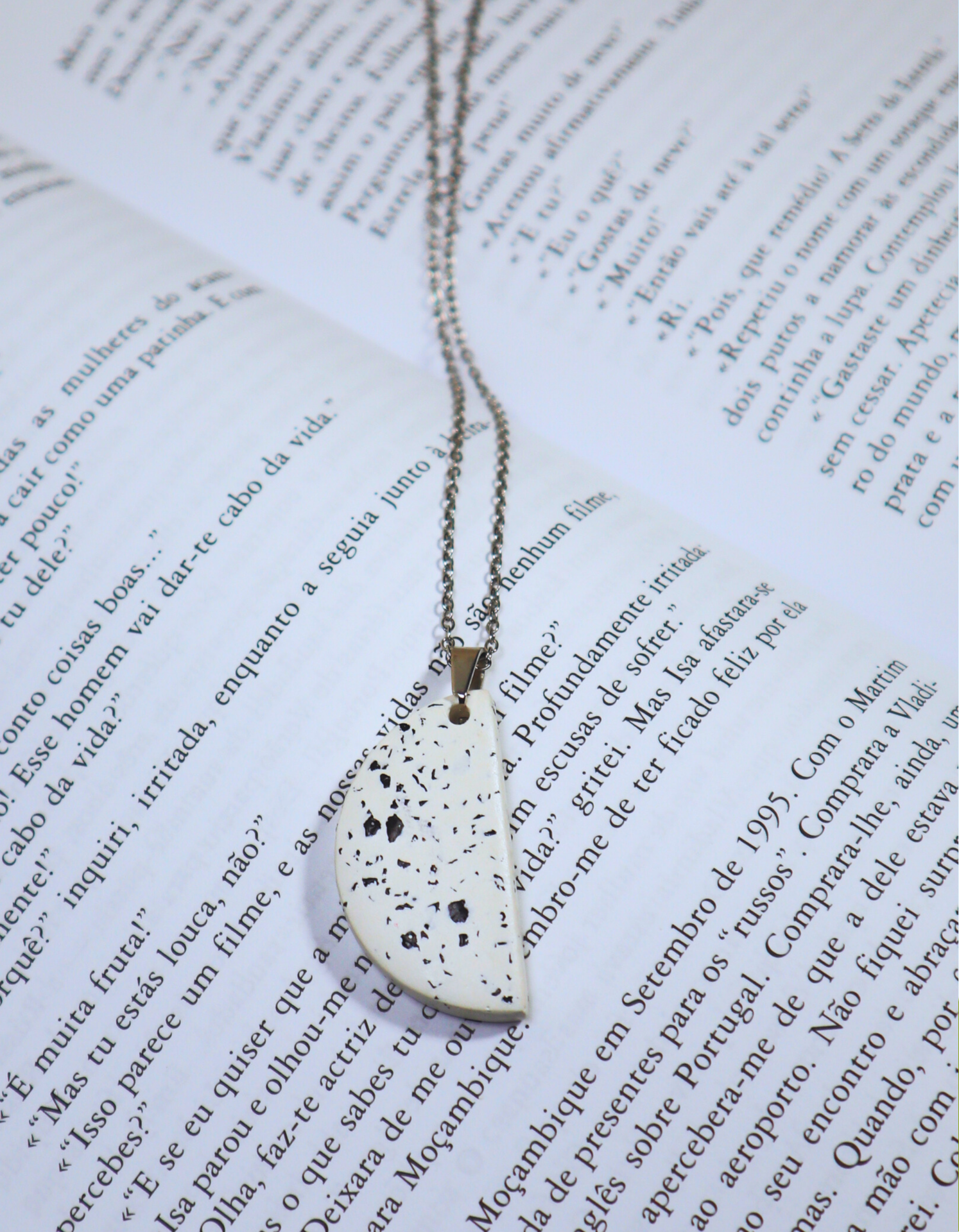 Afirme a sua singularidade com uma peça que resiste ao tempo. O Colar Aurora une a estética orgânica do cimento à durabilidade eterna do aço inoxidável. Cada pendente é moldado à mão, utilizando fragmentos de pedra para criar um efeito terrazzo que é impossível de replicar, tornando a sua peça rigorosamente única no mundo.