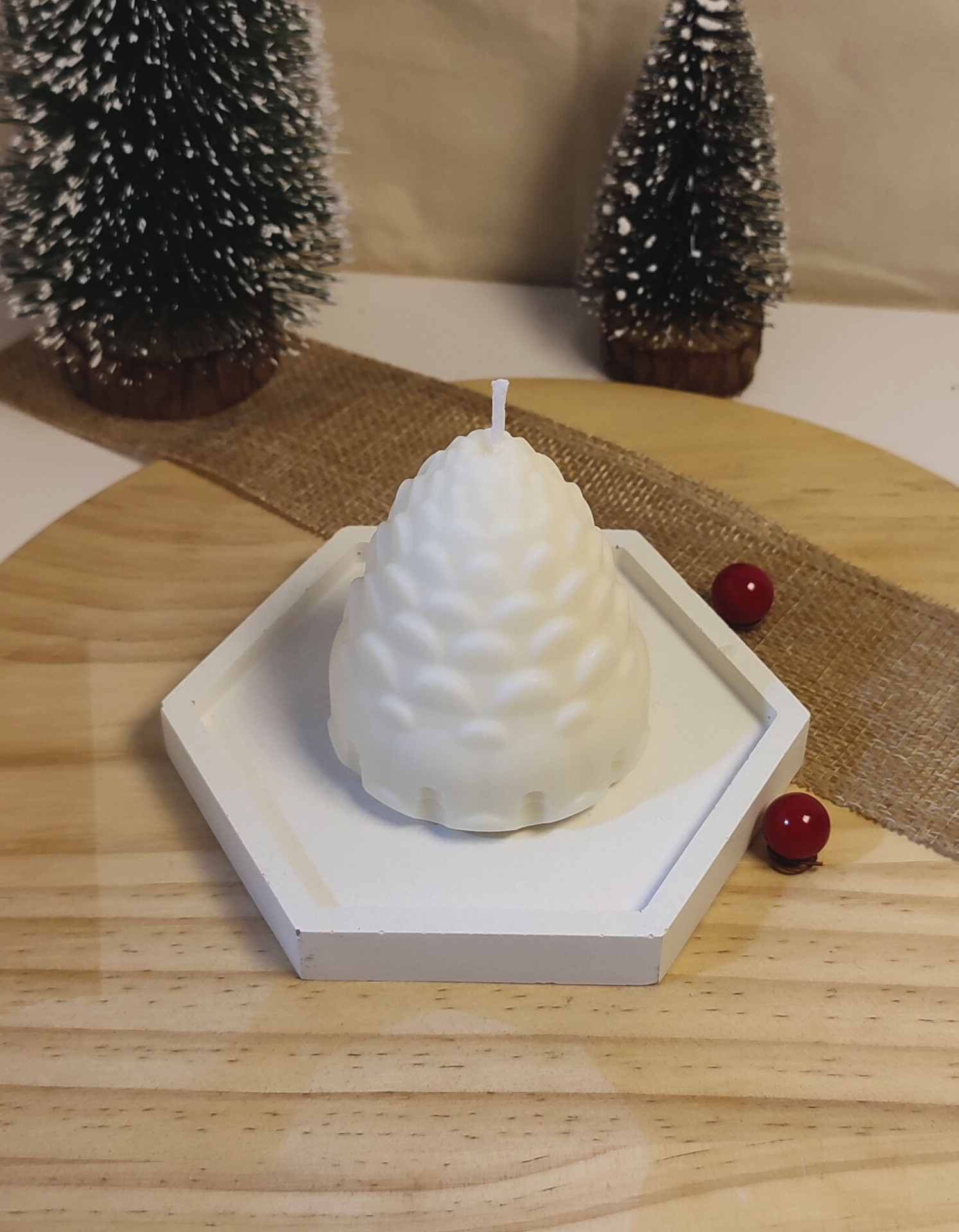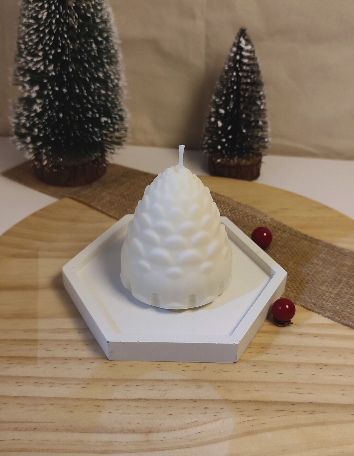 Conjunto de vela decorativa em formato de Pinha de Natal com nossa bandeja hexagonal.
