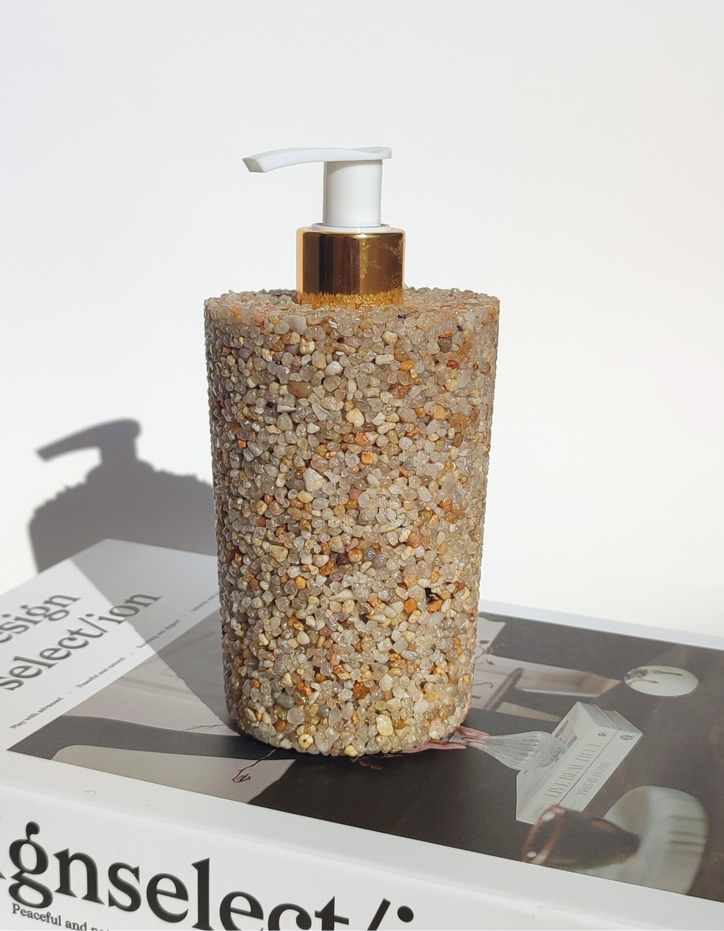O contraste entre a textura rústica das pedras e o detalhe elegante do doseador dourado cria um charme irresistível que eleva instantaneamente qualquer espaço, seja na casa de banho ou escritórios.