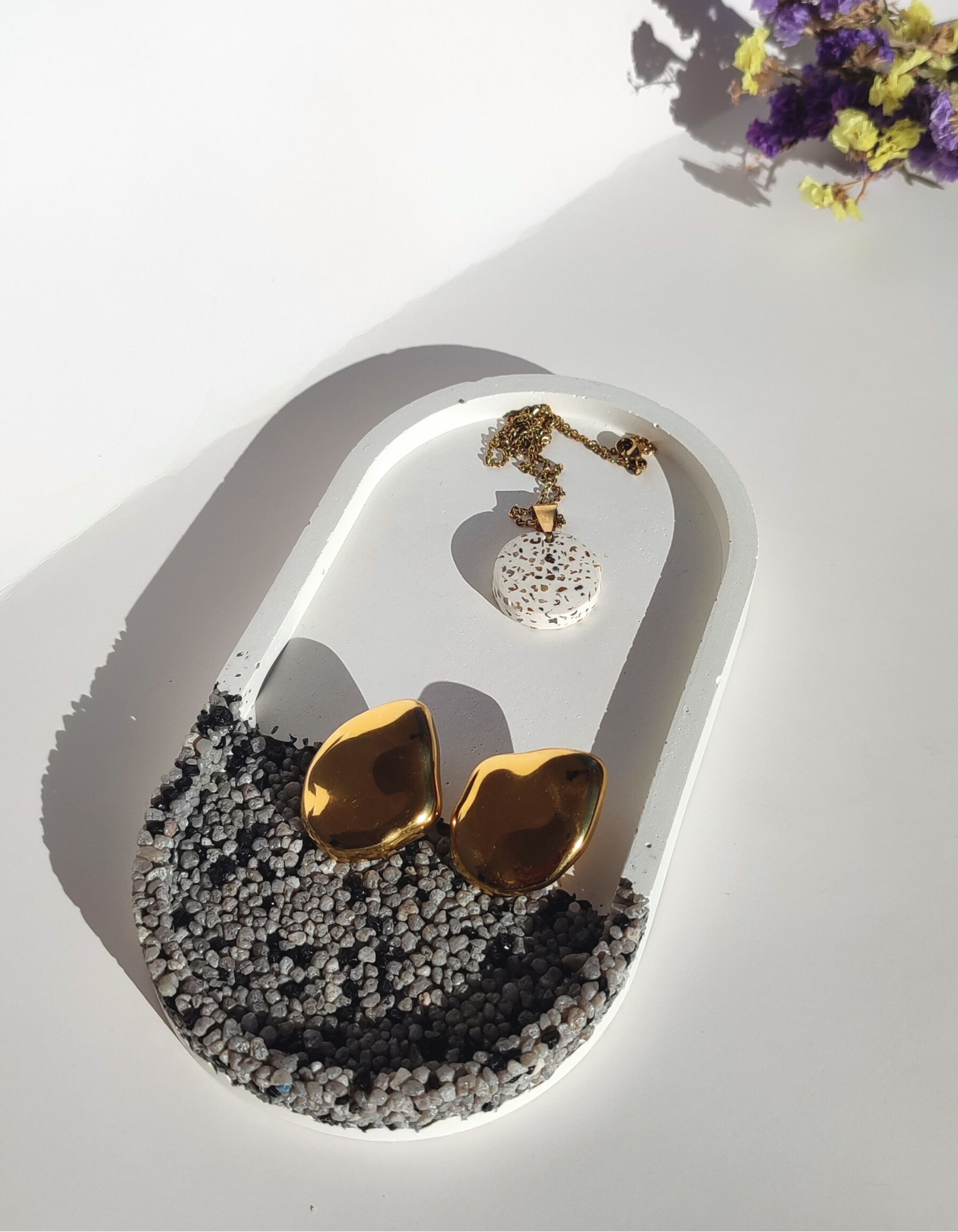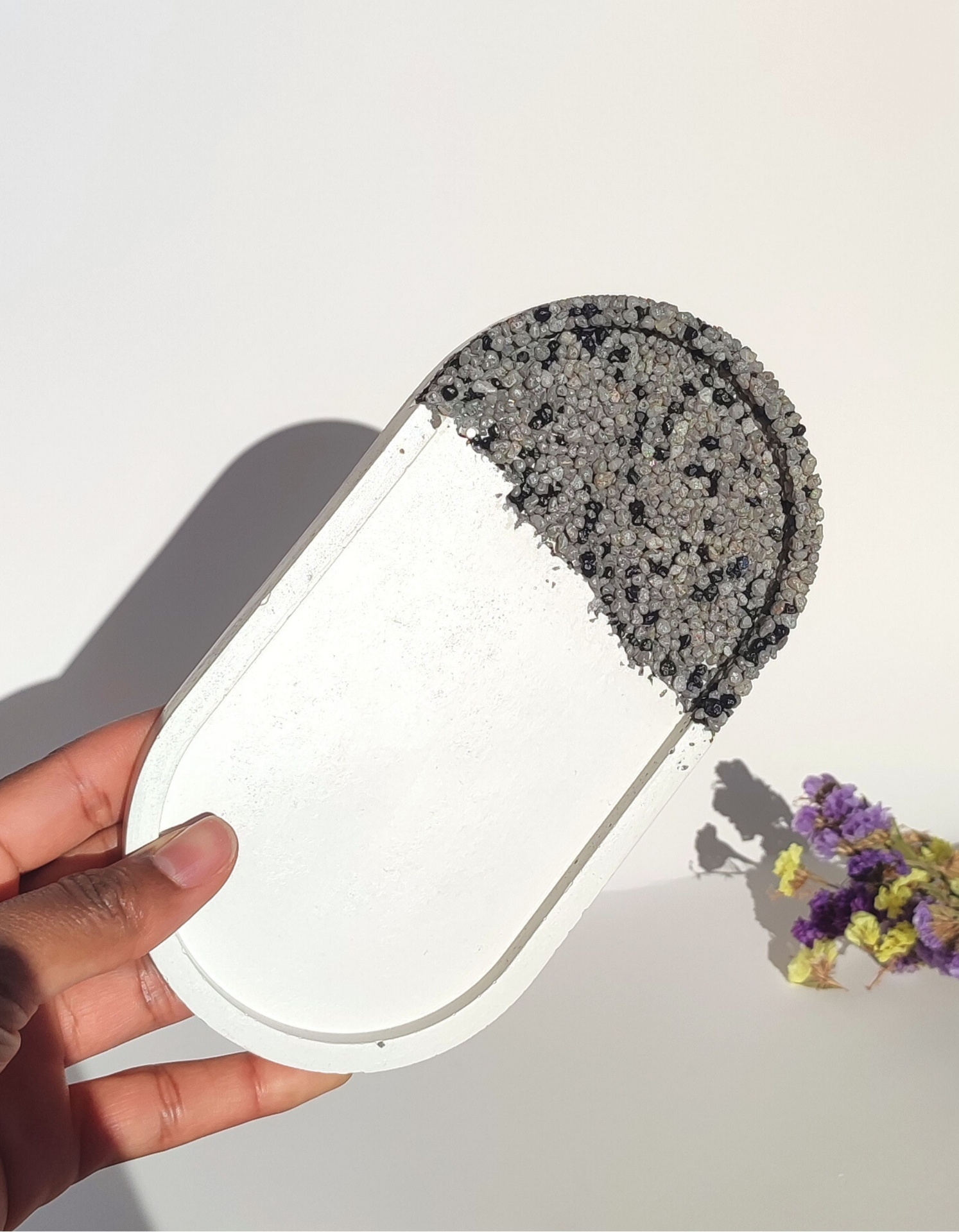 Esta bandeja feita em concreto e pedras do preta e cinza é incrivelmente versátil, podendo ser usada para organizar suas joias e acessórios com estilo, armazenar perfumes, despeja bolsos, exibir difusores ou mesmo para manter a bancada do banheiro organizada.