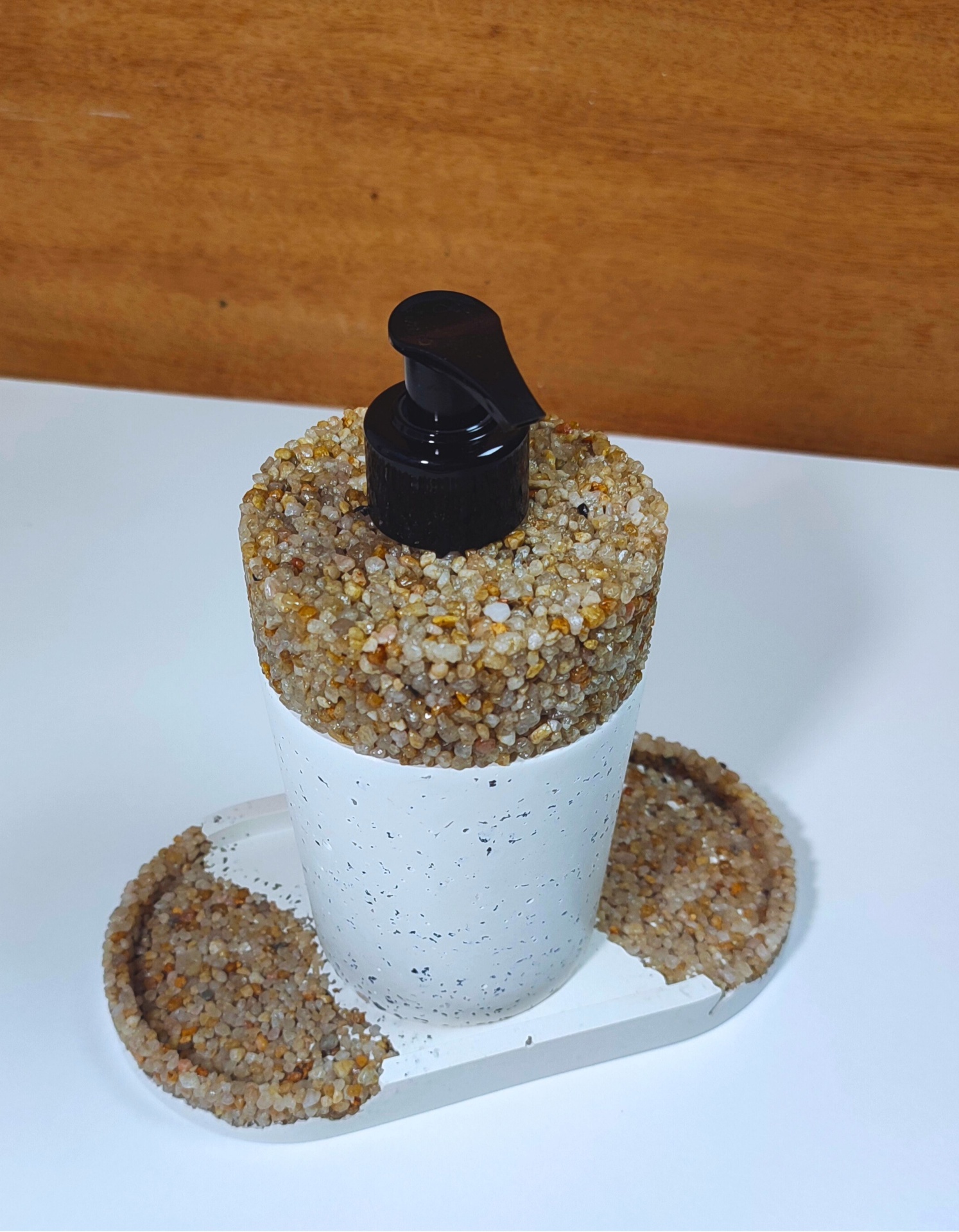 Cada peça é fabricada em cimento e pedras naturais, passando por um processo de moldagem e impermeabilização que garante resistência à humidade e durabilidade, mesmo em ambientes húmidos como a casa de banho.