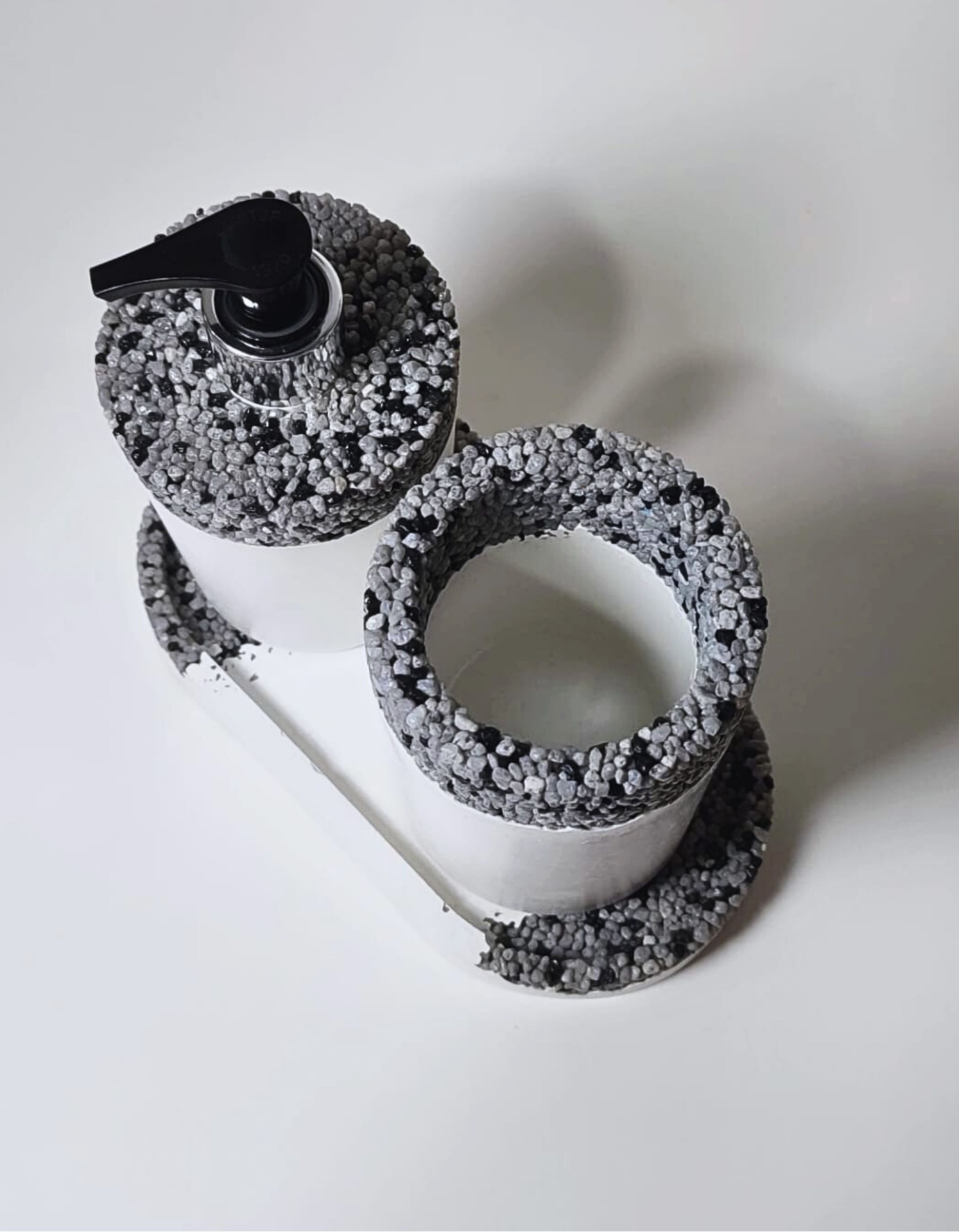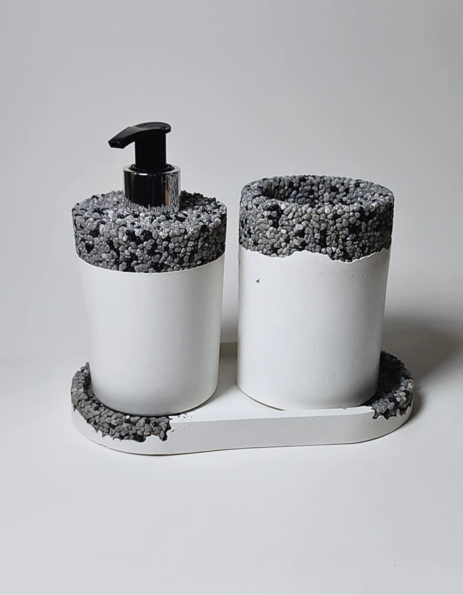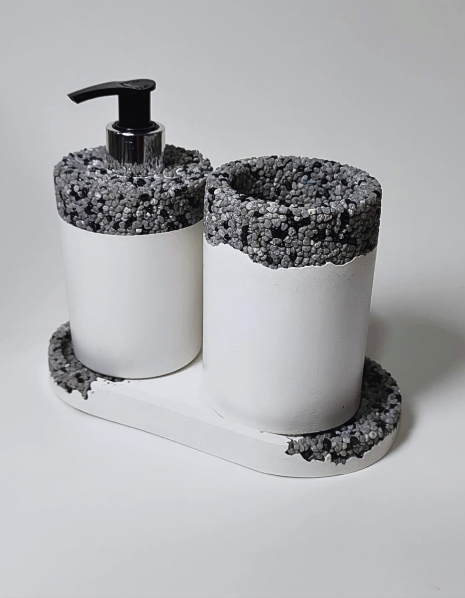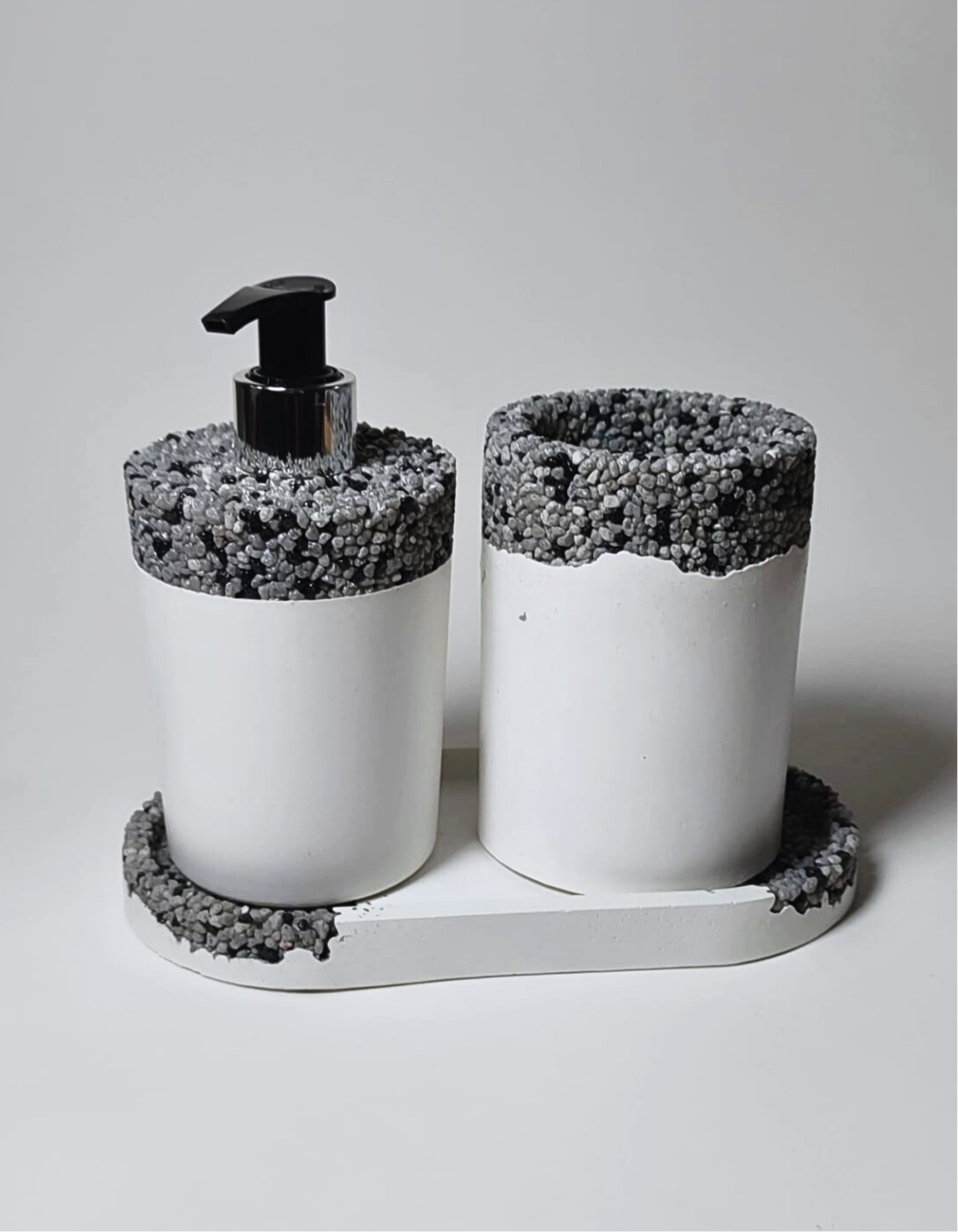 Este conjunto para a casa de banho inclui três peças feitas à mão em Portugal com pedras naturais: um dispensador de sabão, uma bandeja organizadora e um copo para escovas.