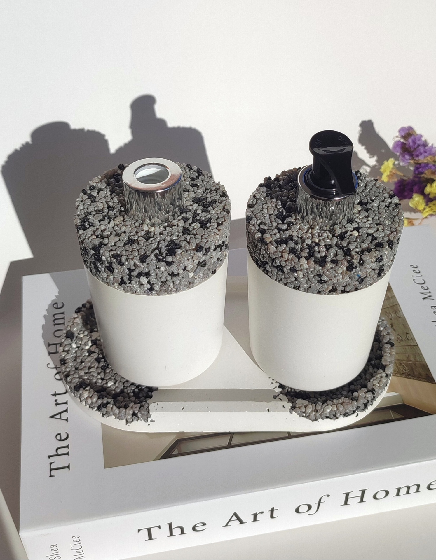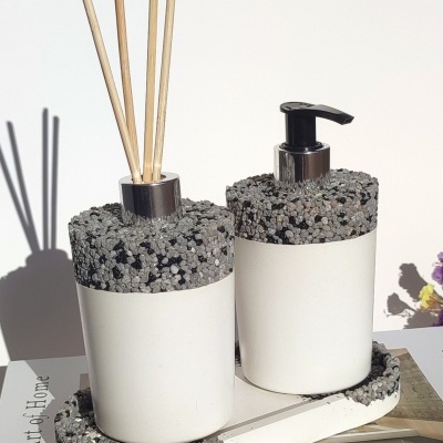 Este conjunto para a casa de banho inclui três peças feitas à mão em Portugal: um dispensador de sabão, uma bandeja organizadora e um difusor líquido.