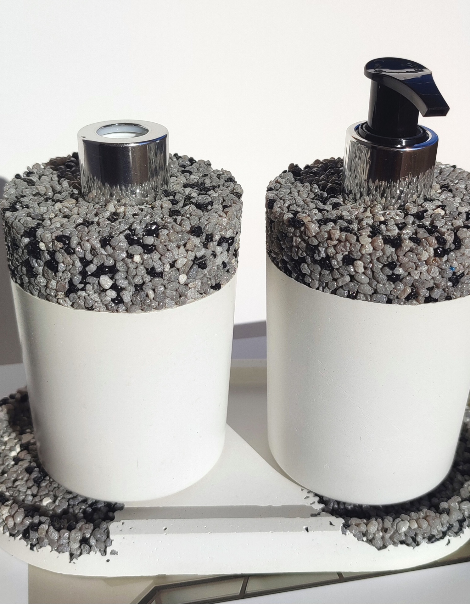 Cada peça é fabricada em cimento e pedras naturais, passando por um processo de moldagem e impermeabilização que garante resistência à humidade e durabilidade, mesmo em ambientes húmidos como a casa de banho.