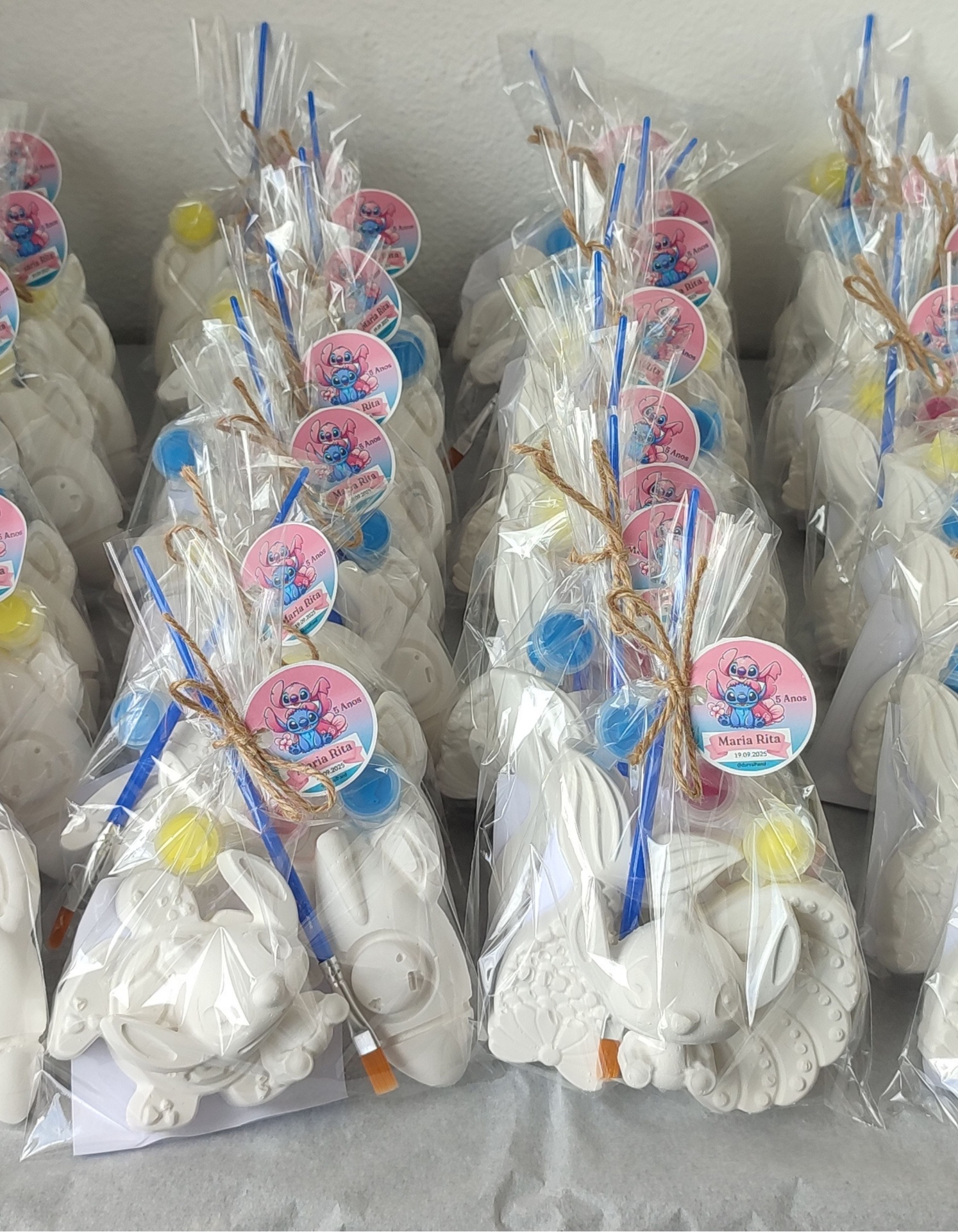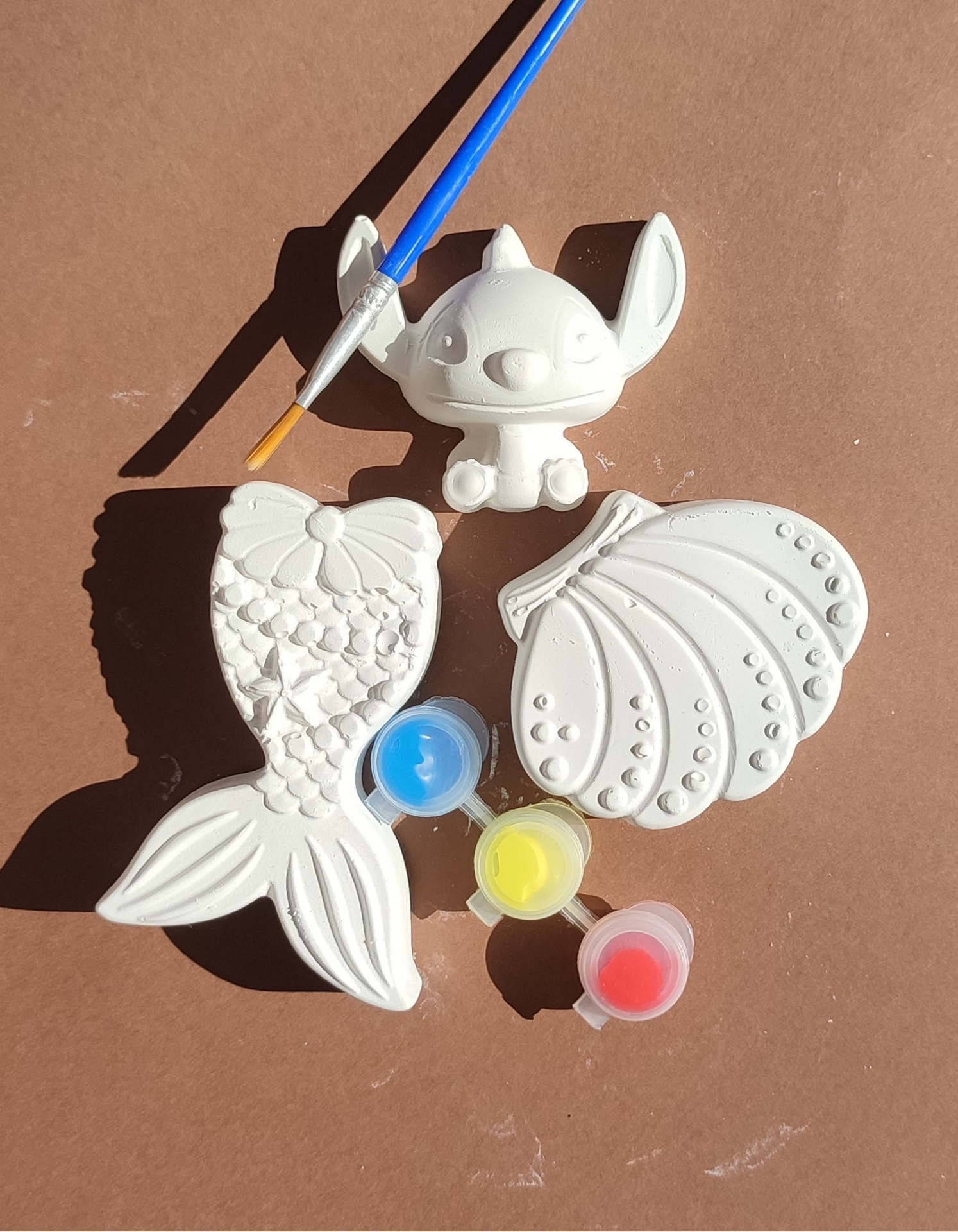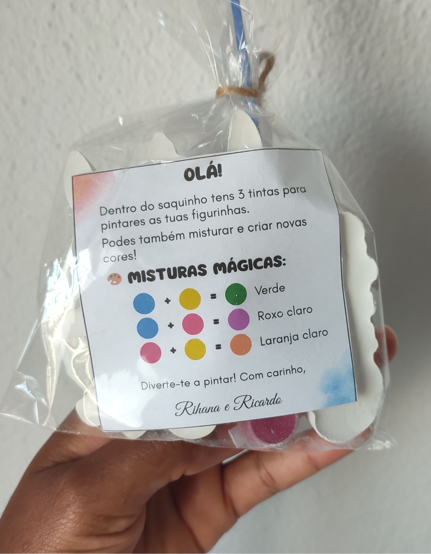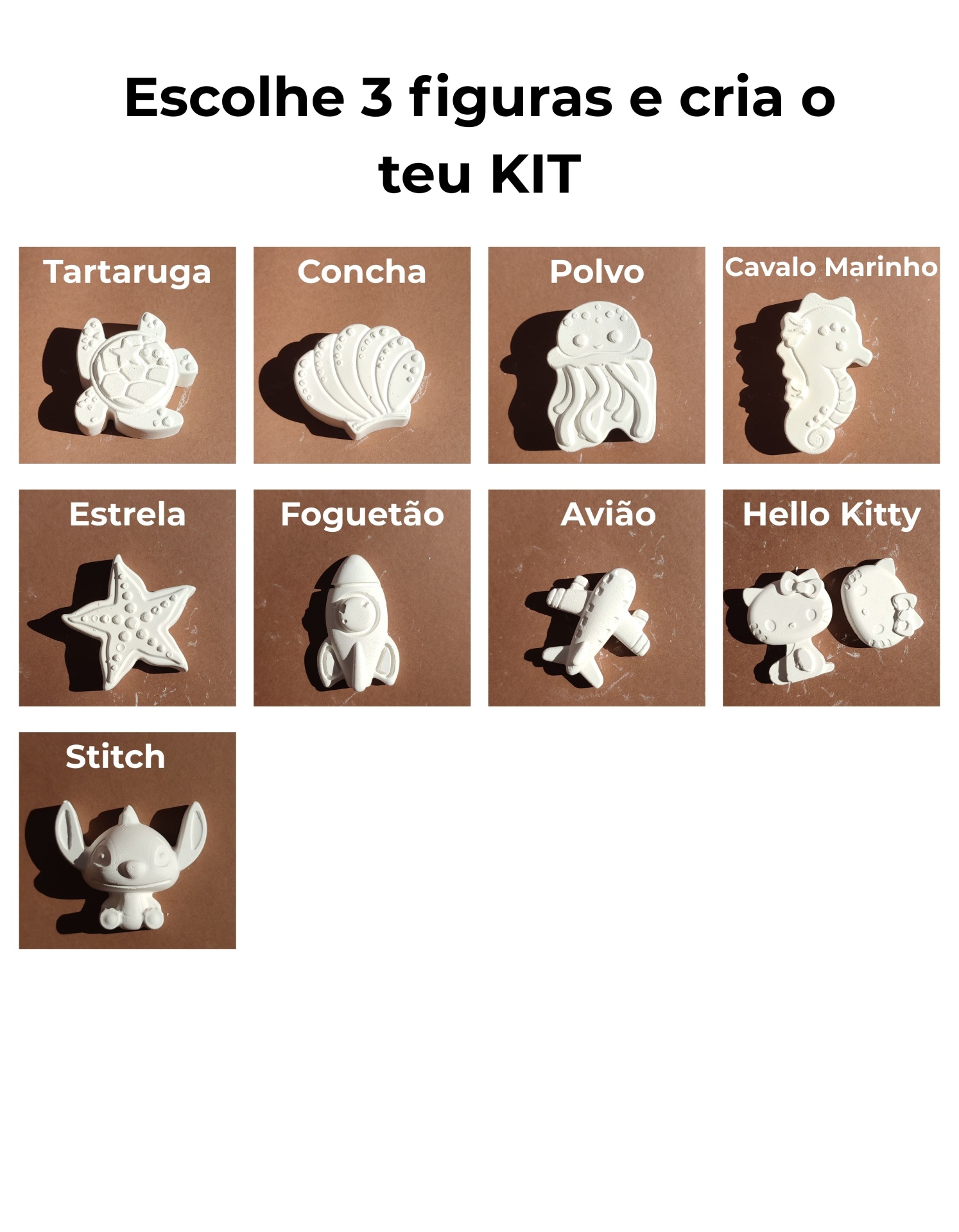 Cada kit inclui figurinhas em cimento branco, tintas coloridas e pincel, para que as crianças possam dar explorar a imaginação e divertir-se a pintar.