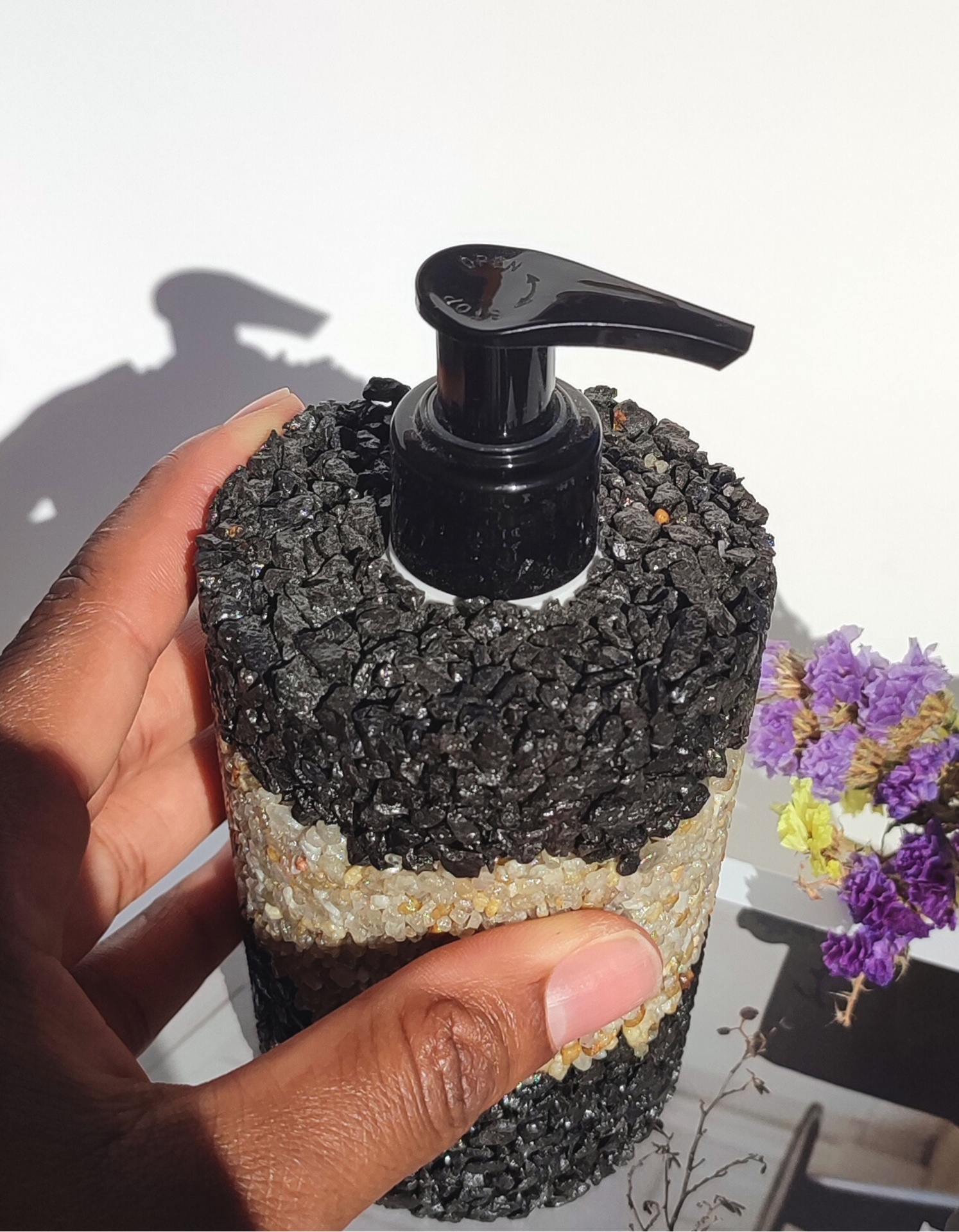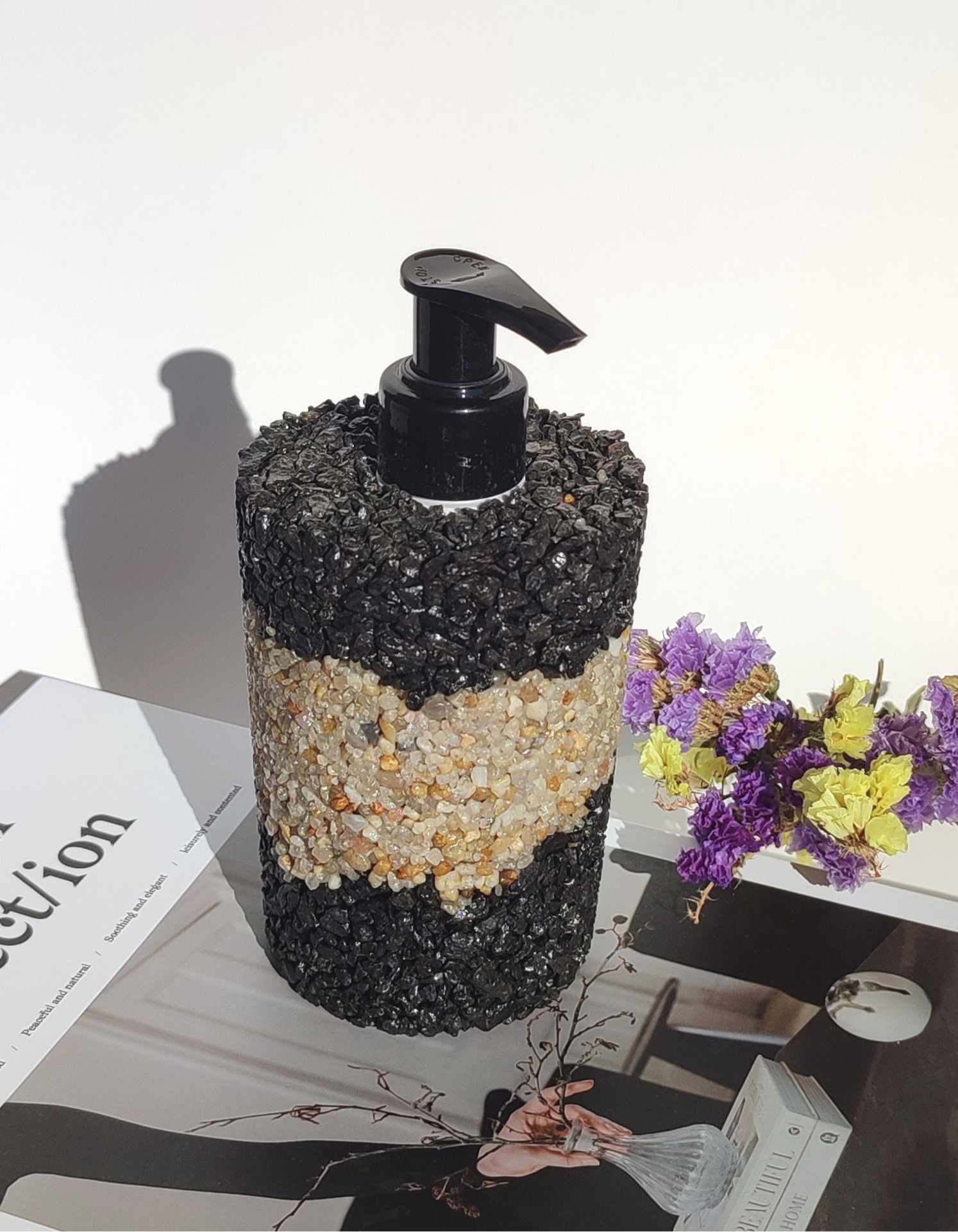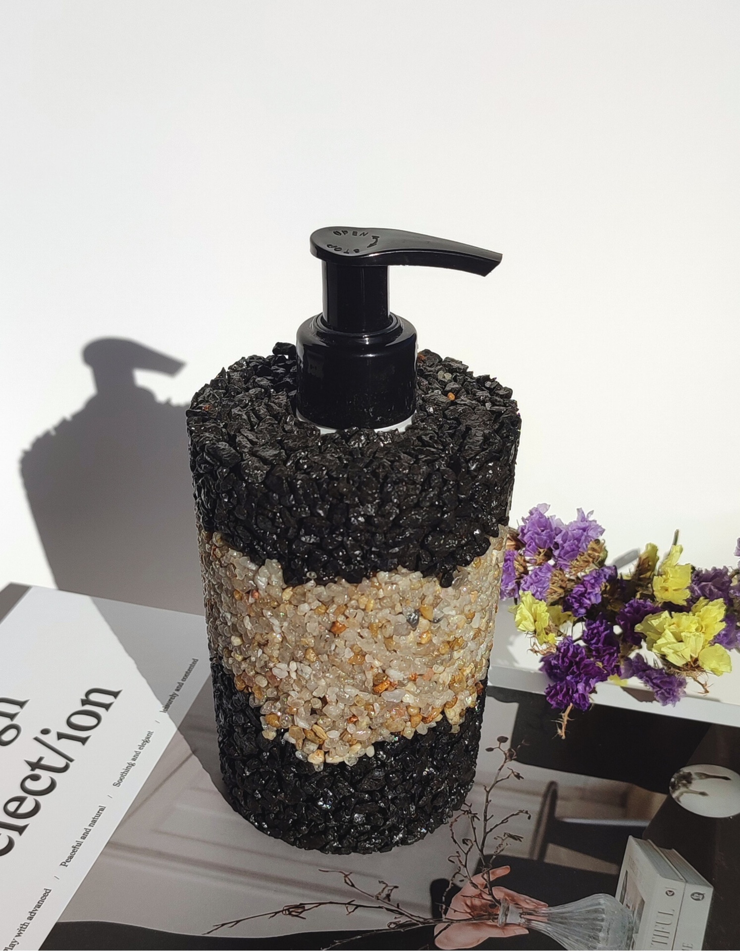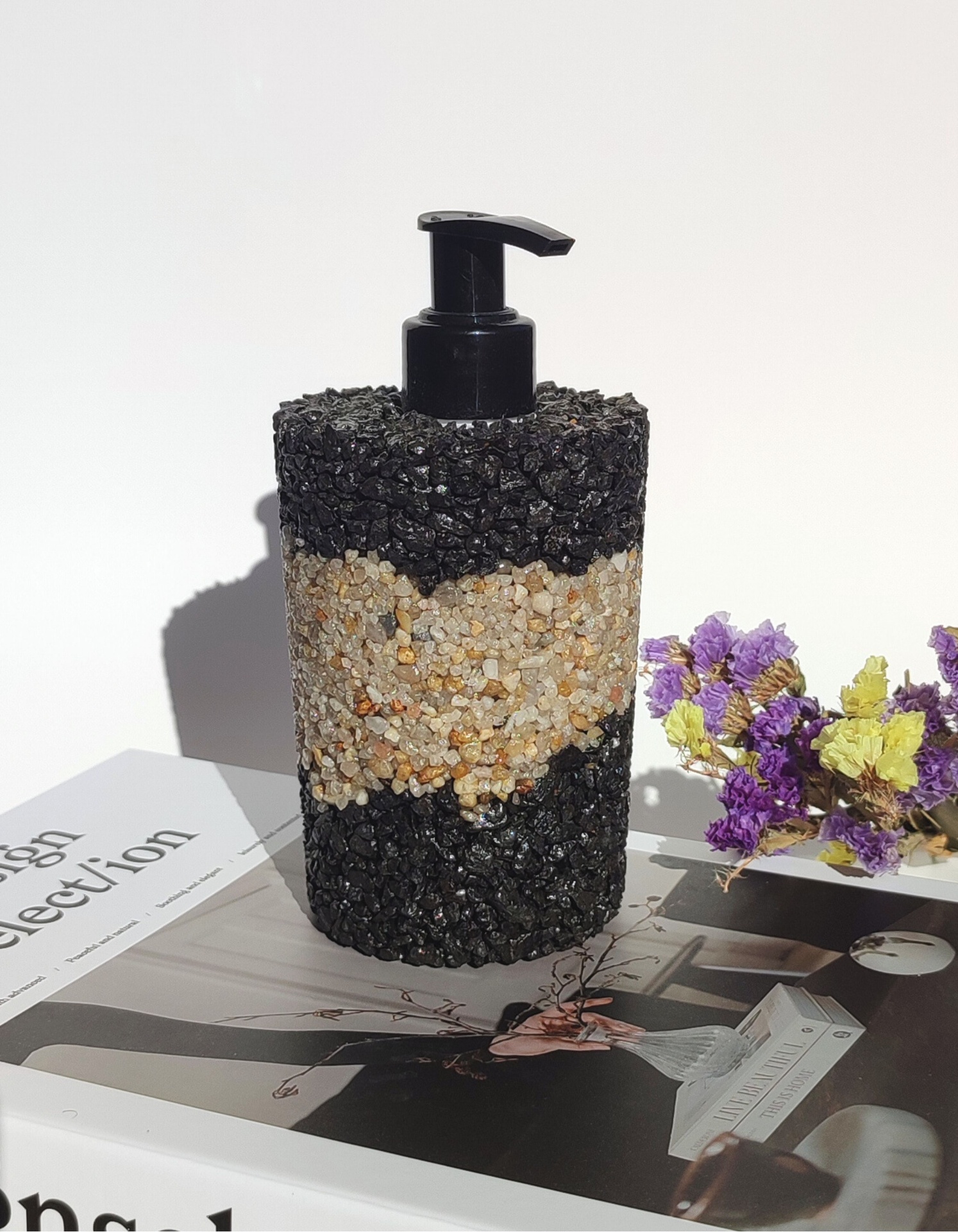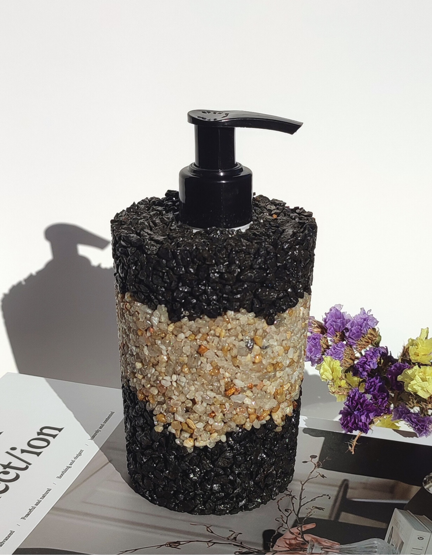 Dê um toque de sofisticação ousada à sua casa com este dispensador de sabonete em pedras naturais. O contraste entre as pedras pretas elegantes e a faixa central em pedras do rio cria uma peça de design moderna e exclusiva, perfeita para quem valoriza estilo e originalidade.