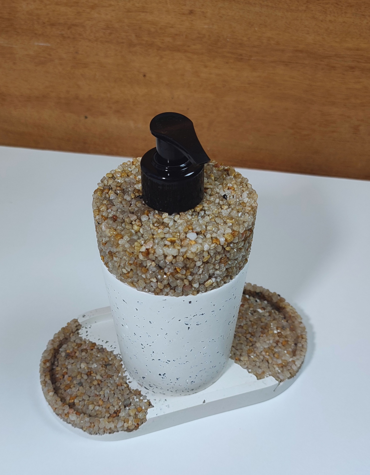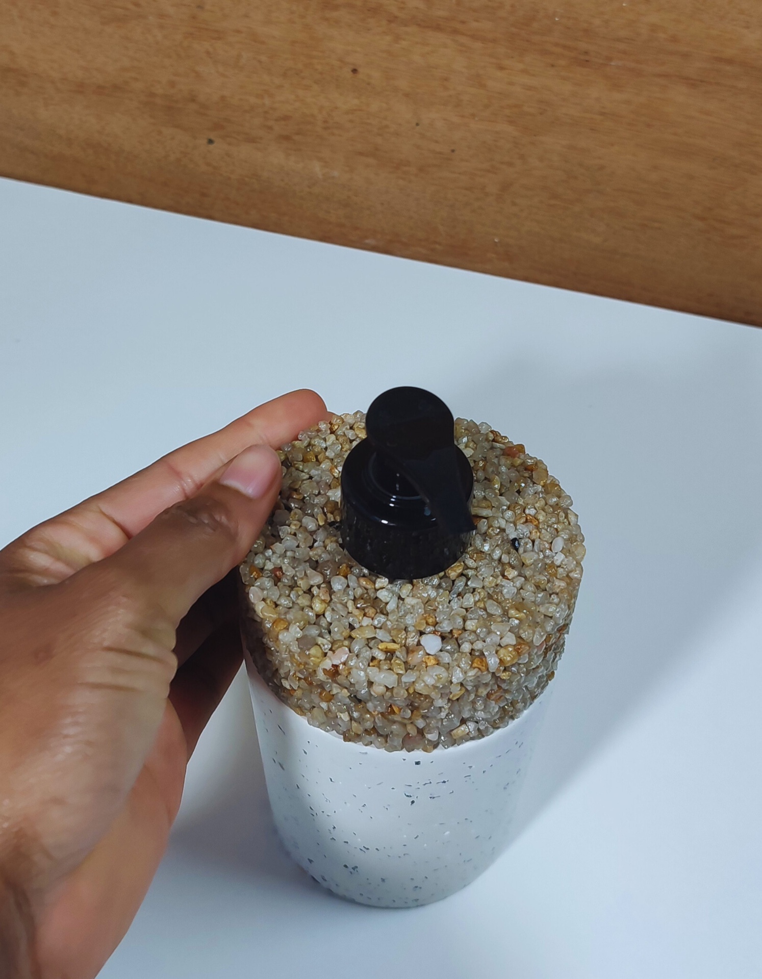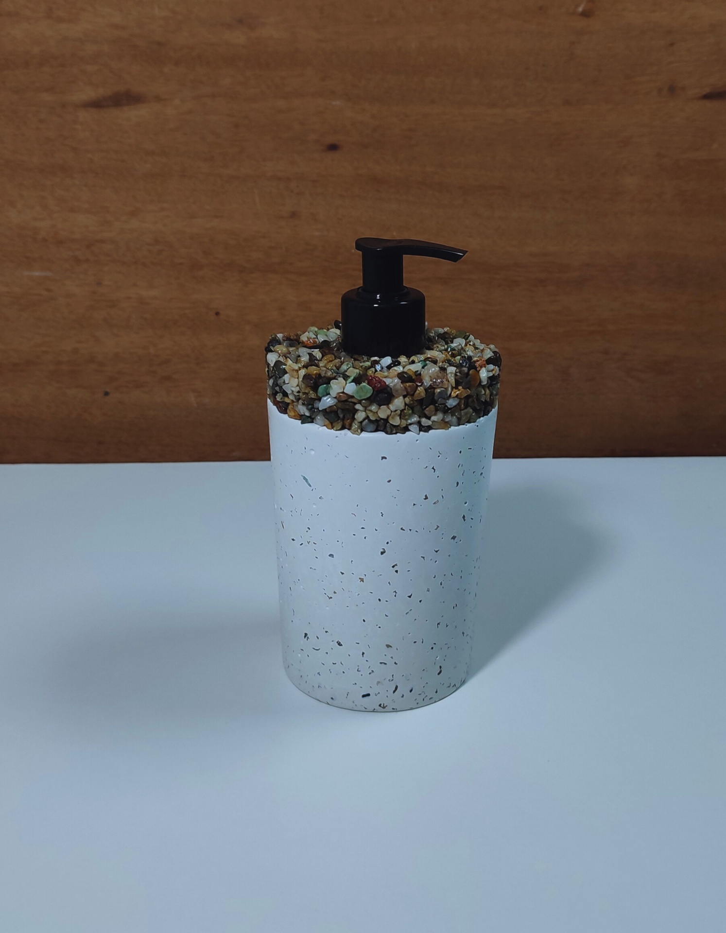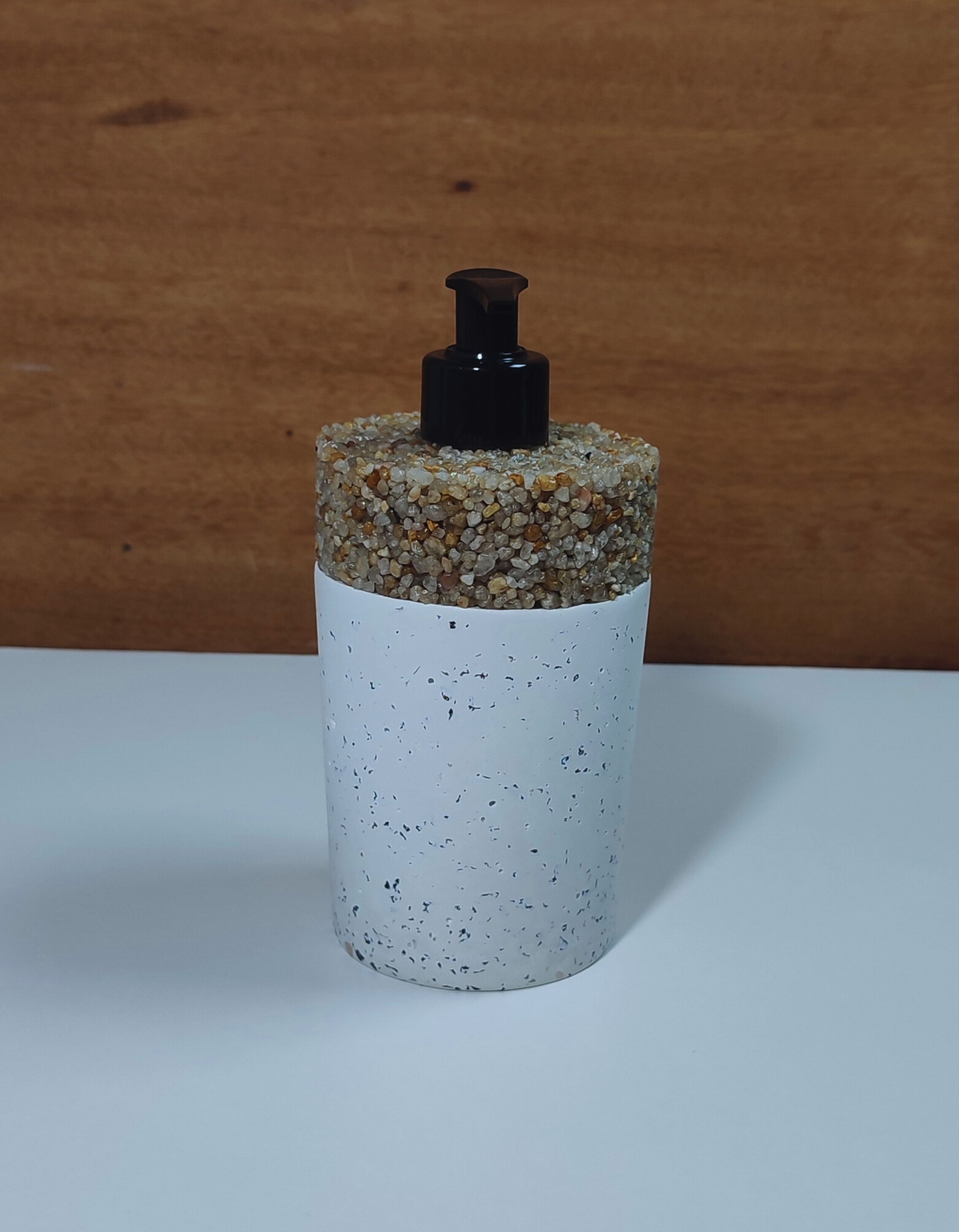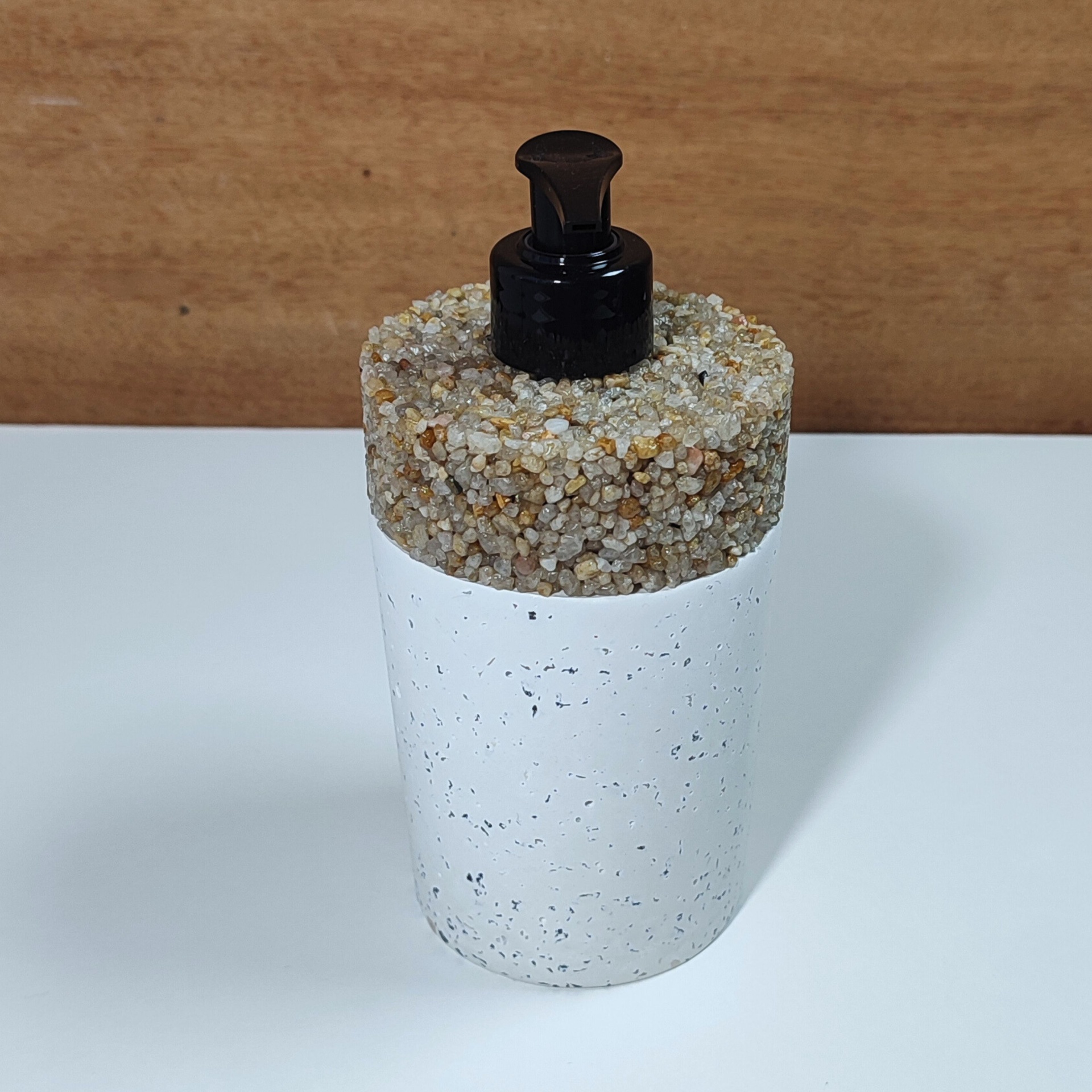 Uma forma elegante de acomodar o sabonete líquido, este dispensador com efeito granilite e pedras resinadas vai dar um pouco de luxo à sua casa de banho. Pode encher este dispensador recarregável uma e outra vez com o seu sabonete líquido favorito. Este acessório com o seu design elegante e sofisticado vai tornar-se uma peça essencial. Aposte na sofisticação e adquira esta peça original e única. Também pode combiná-lo com os outras peças.