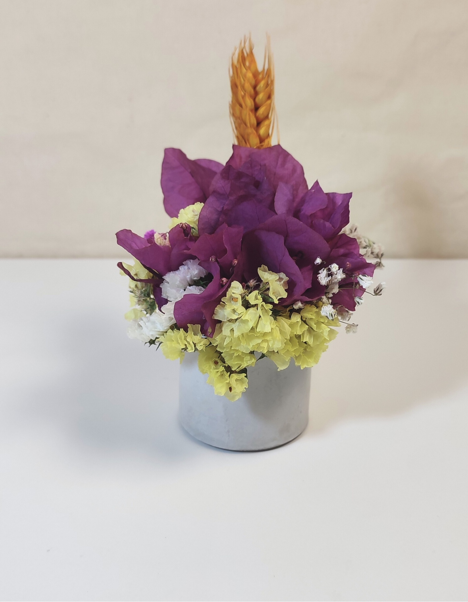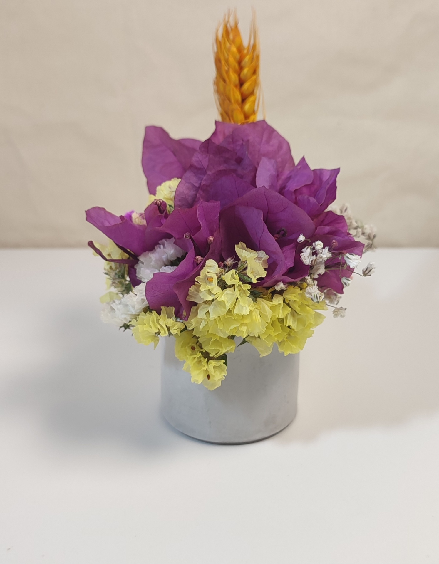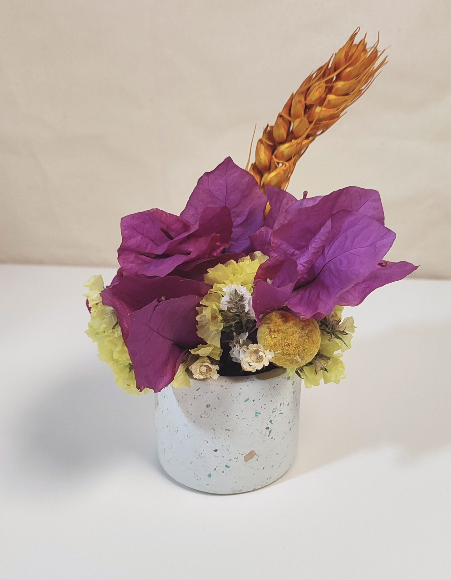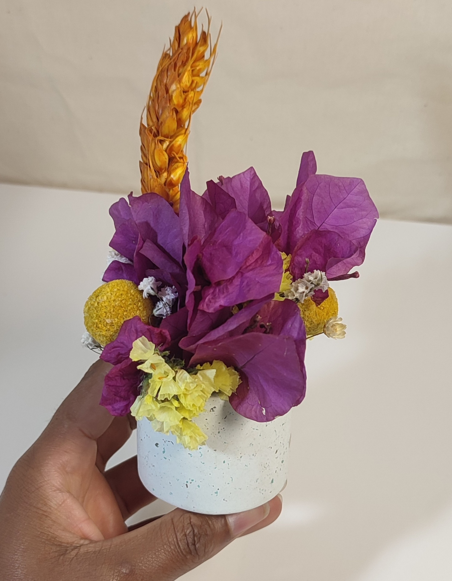 Este arranjo combina a elegância das flores secas com a modernidade do vaso em concreto granilite, criando uma peça única e sofisticada. Ideal para trazer um toque natural e campestre a qualquer espaço.