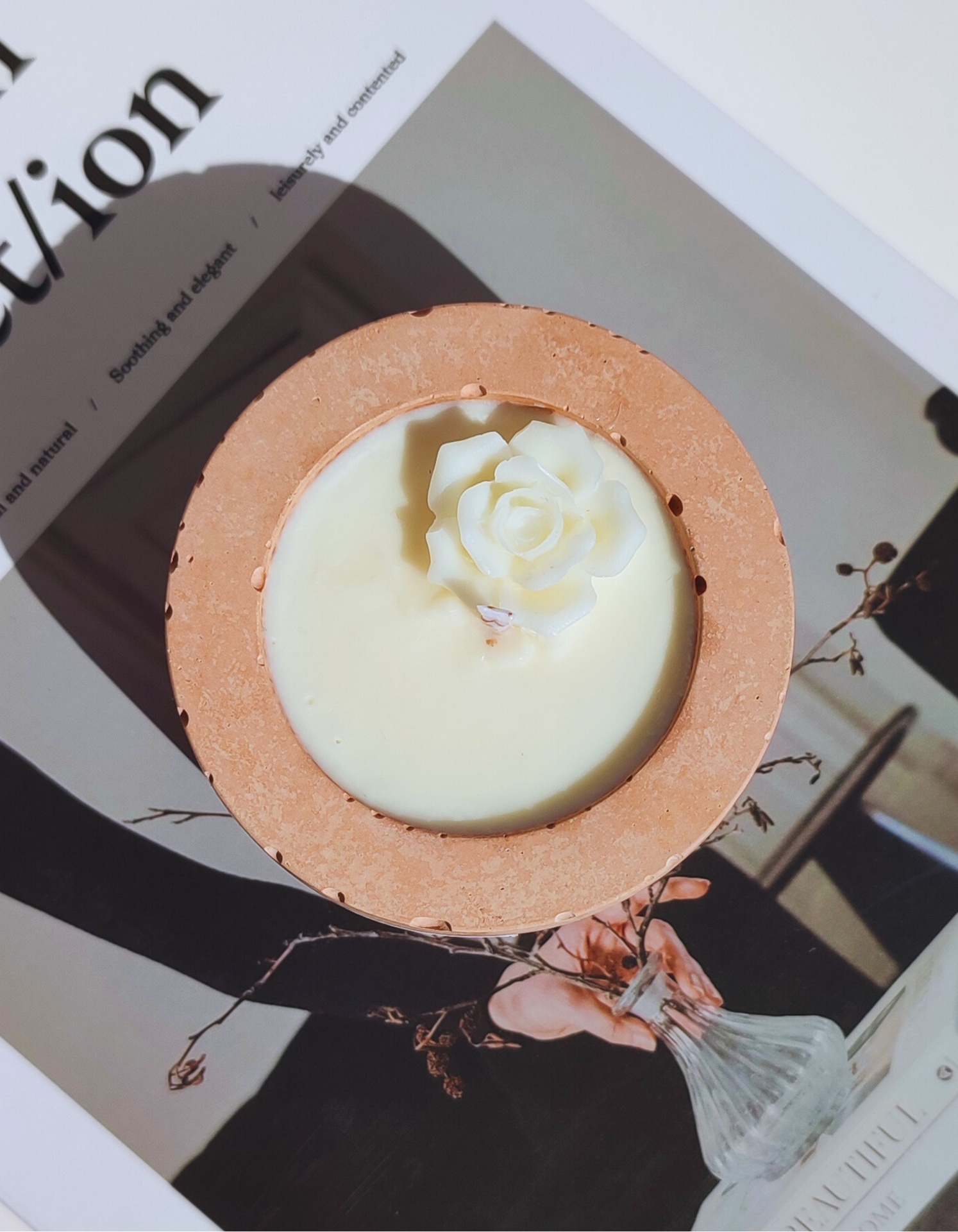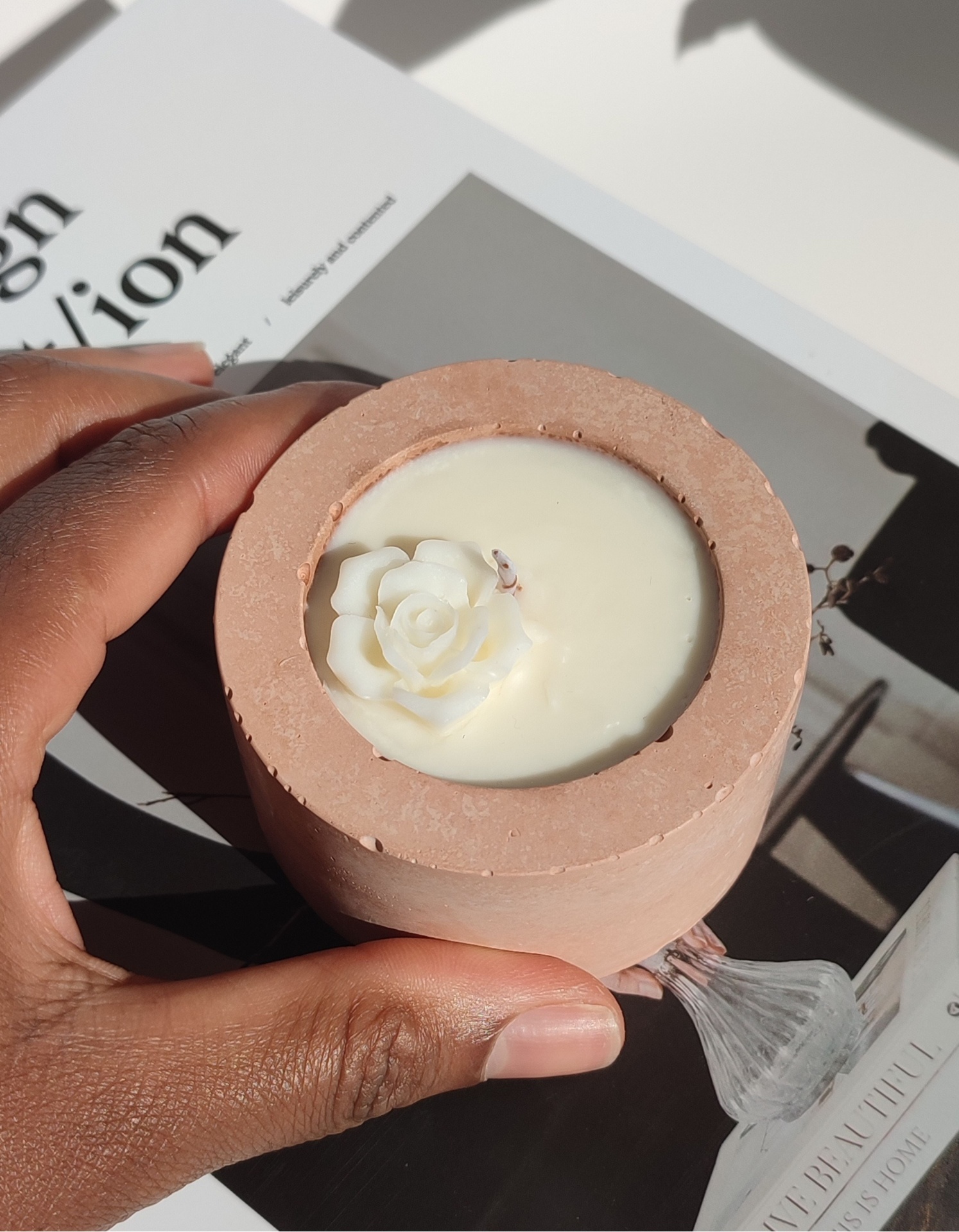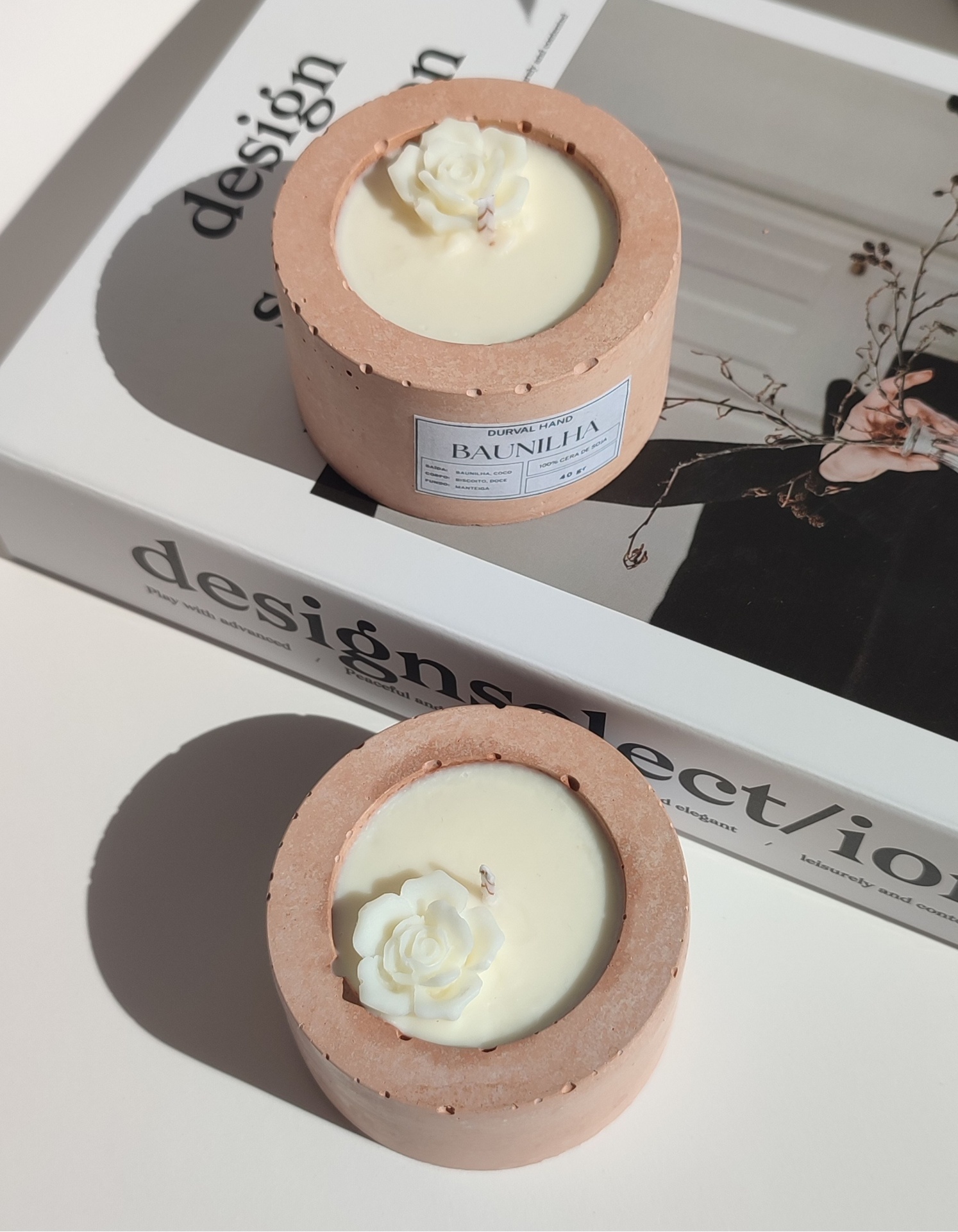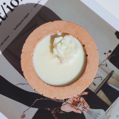 Vela aromática produzida artesanalmente com cera de soja e coco e pavio de algodão, garantindo uma queima mais limpa e lenta.