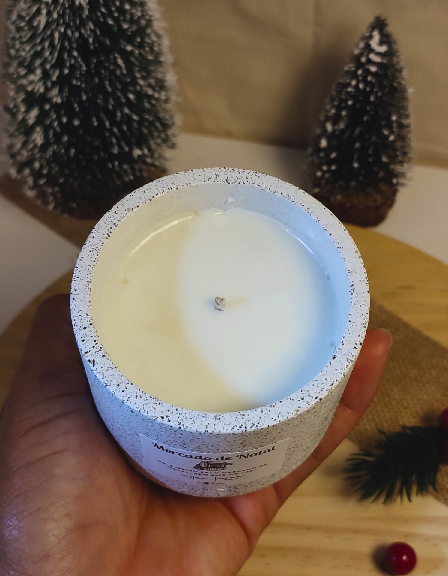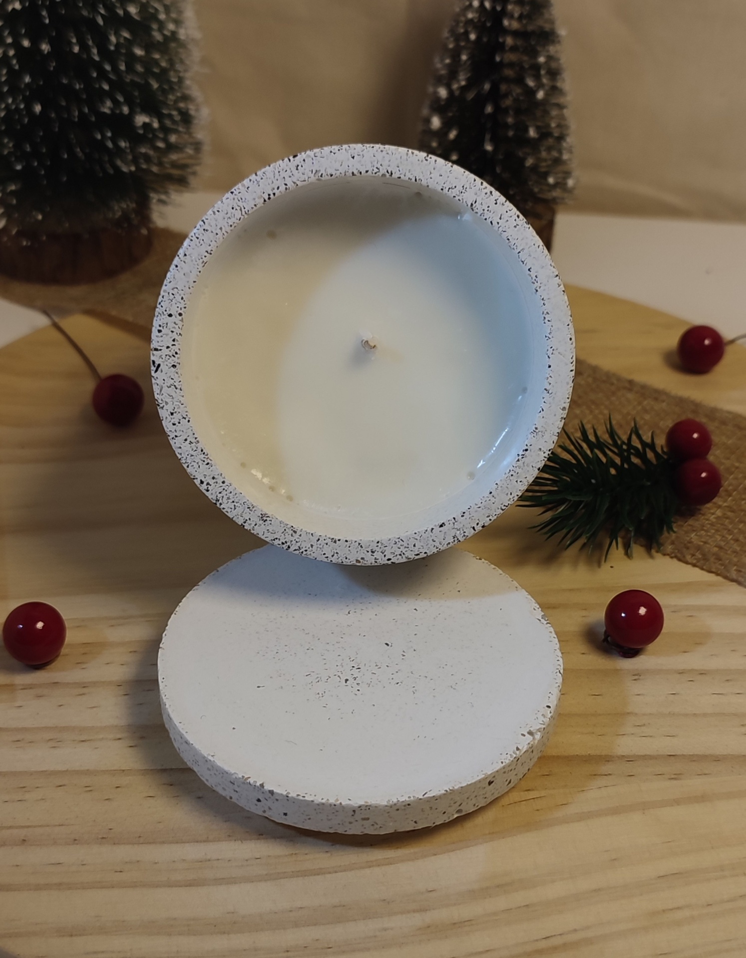 Criada em cera de soja e coco, em elegante pote de concreto com tampa, design contemporâneo, pesado, duradouro e perfeito para compor decoração de Natal e de inverno.