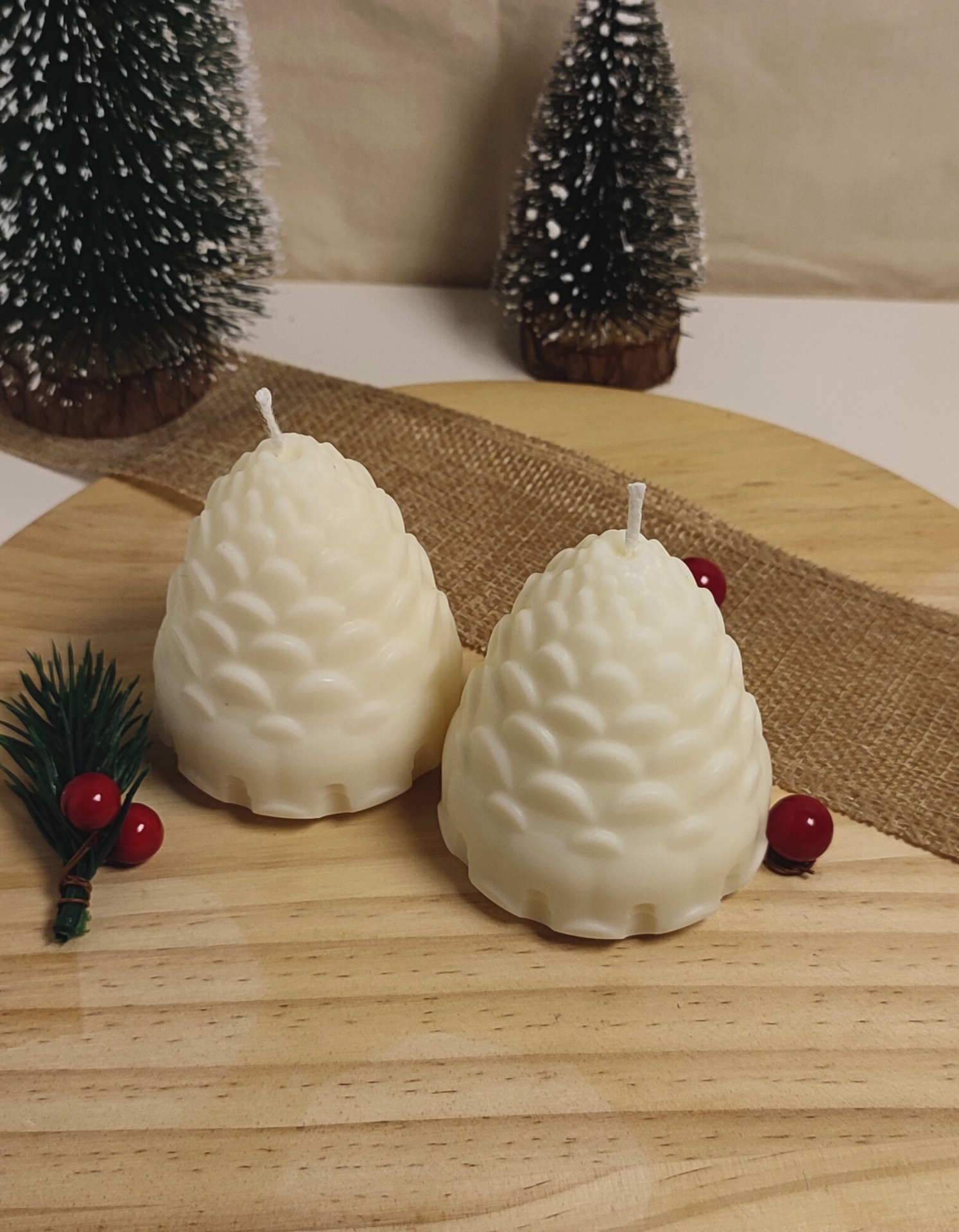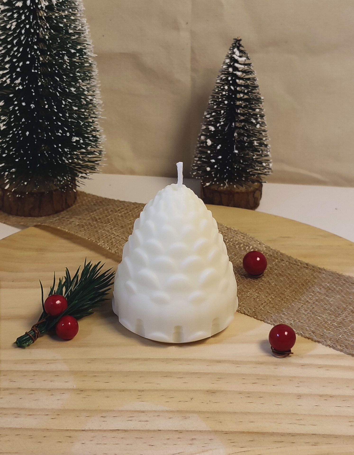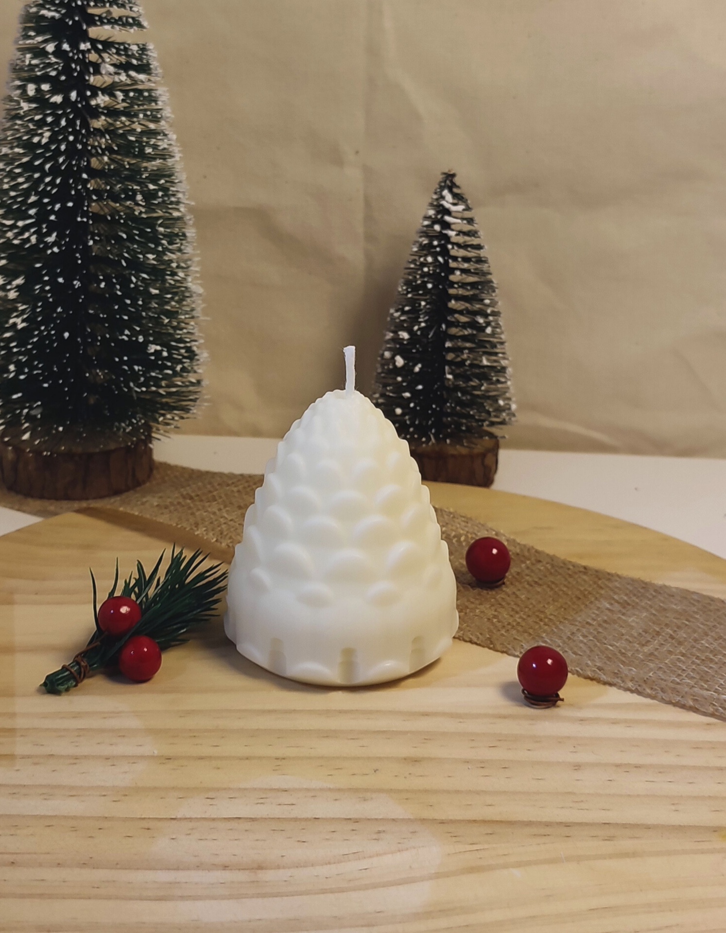 Vela decorativa moldada no formato de pinha, com design artesanal detalhado e acabamento realista.
