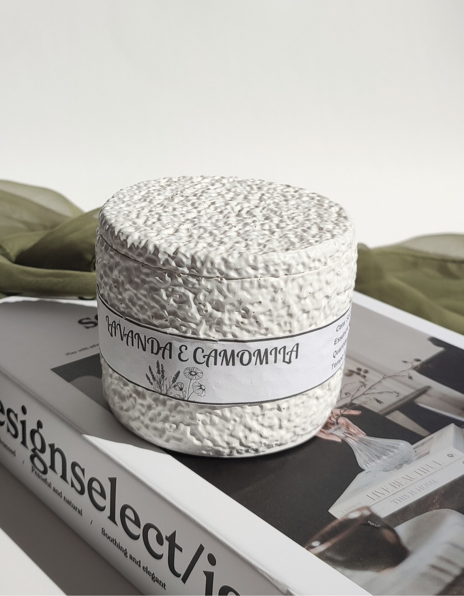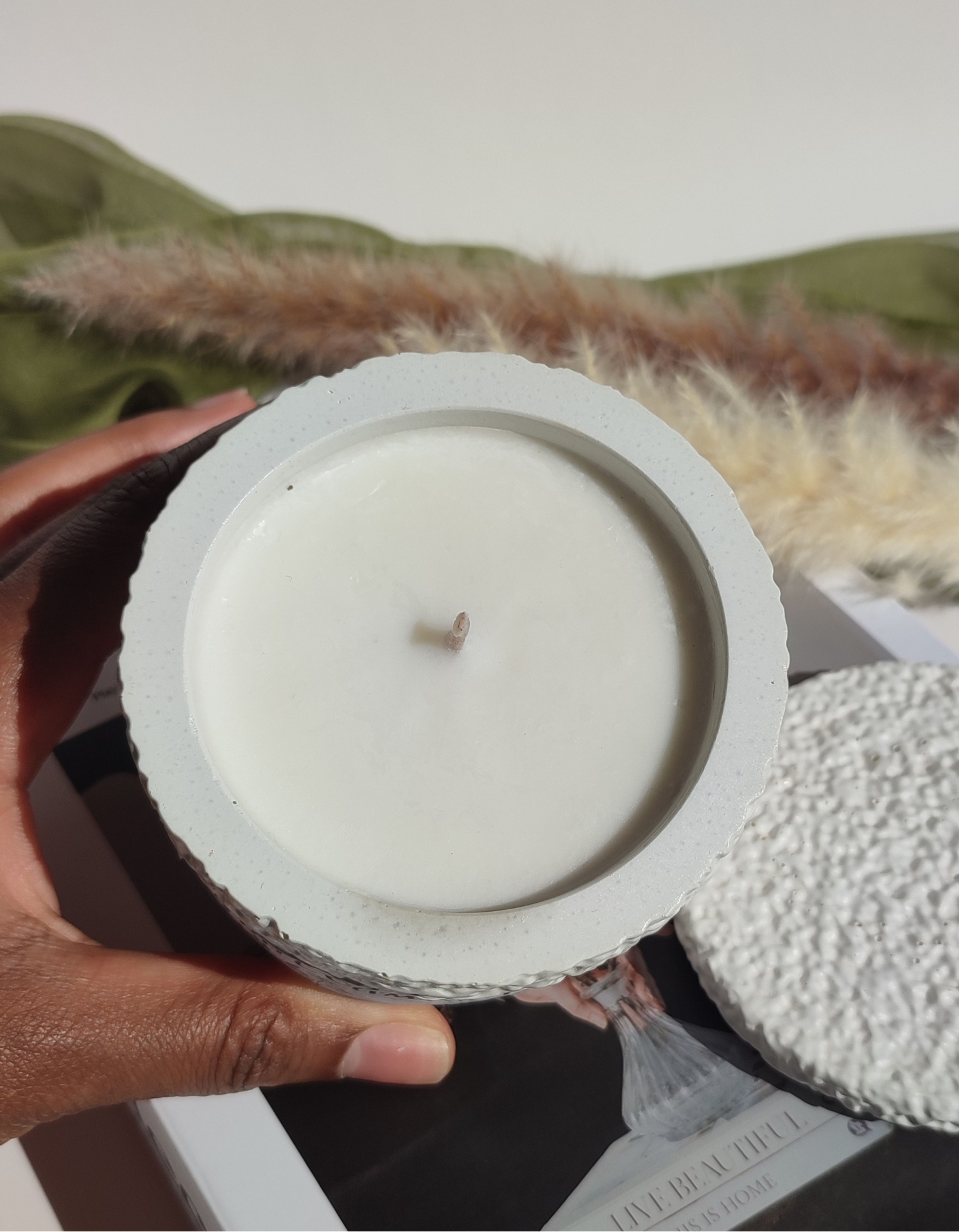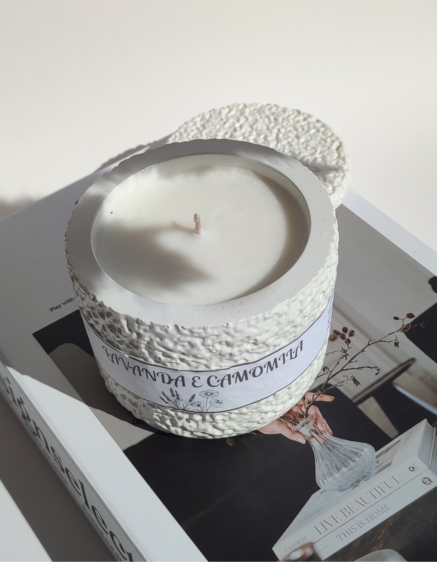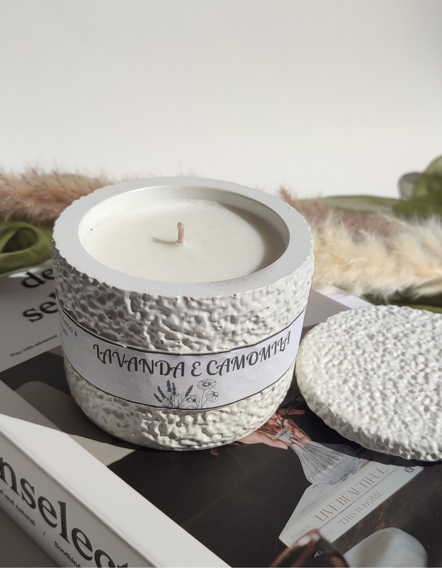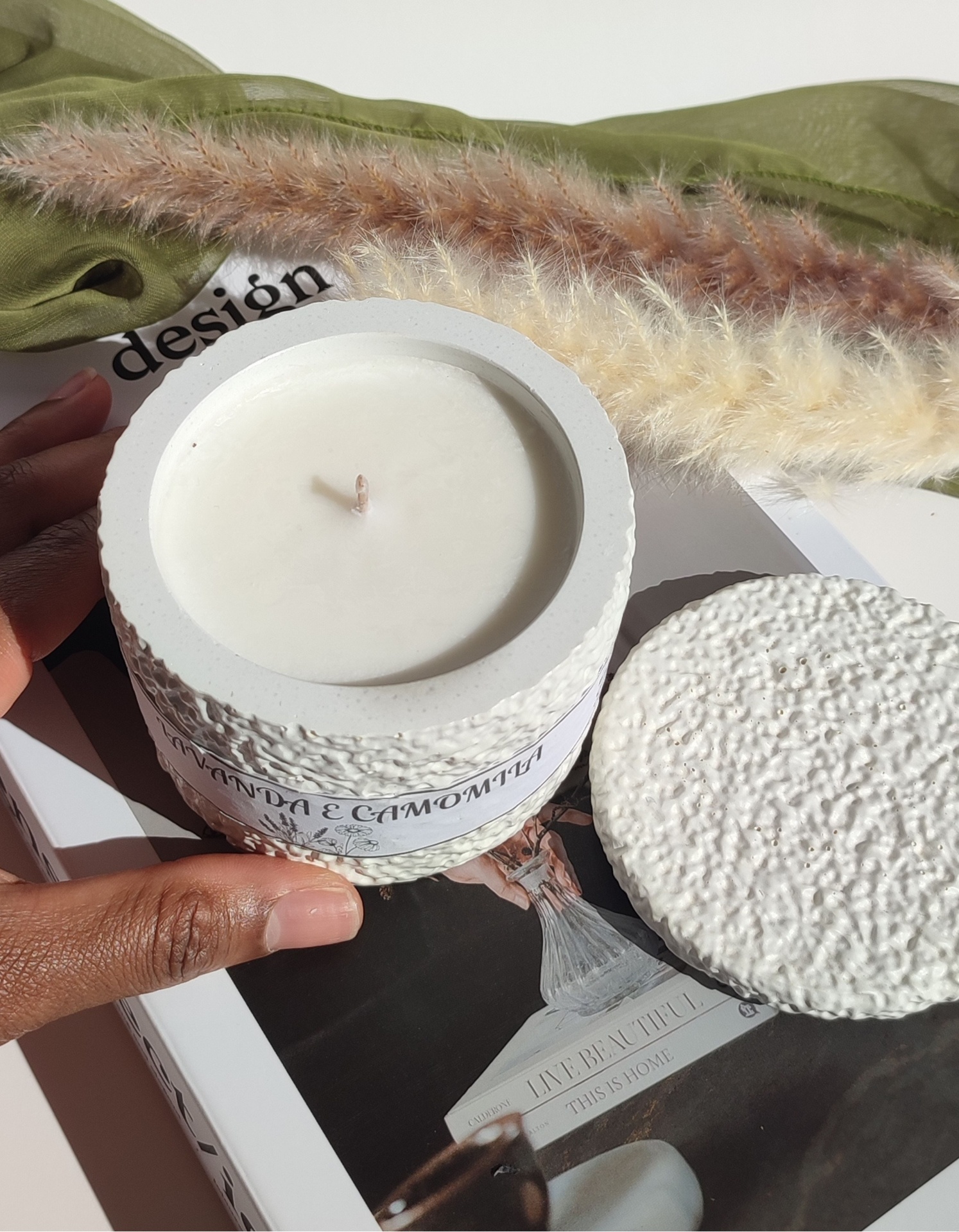 Vela aromática produzida artesanalmente com cera de soja e coco e pavio de algodão, garantindo uma queima mais limpa e lenta.